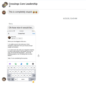 In 2020, I was in Core during the so-called “hater uprising.” I still have the messages. I recently read through them, hoping to find guidance. What I found instead was that if you speak out against the Crossings Church, you will be blocked, banned, and subjected to internal scrutiny. That is not hyperbole. I have the receipts.